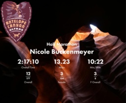 | Finish | 13.23 | 2:17:10 | 10:22/miles | 1.23 | 14:51 | 12:03/miles | 12 | 3 F | 3 F Overall |