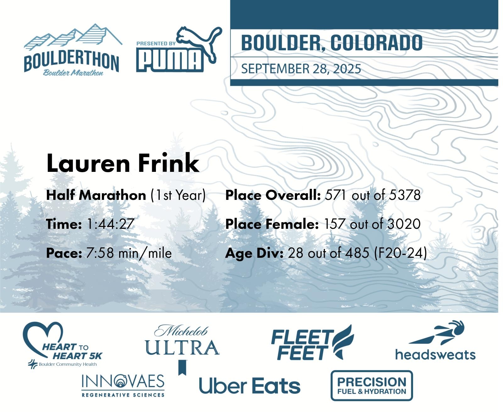 Date: Sept. 28, 2025 Participant: Lauren Frink #24237 Race: 2025 Boulderthon Half Marathon Distance: 13.1 miles Weather: Perfect running weather with temperatures in the 50's to 70's and nice cloud cover