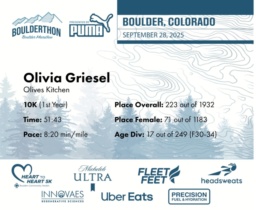 Date: Sept. 28, 2025 Participant: Olivia Griesel #31903 Race: 2025 Boulderthon 10K Distance: 6.2 miles Weather: Perfect running weather with temperatures in the 50's to 70's and nice cloud cover