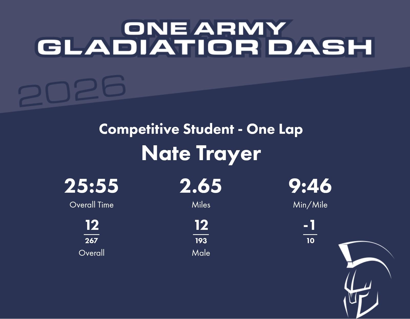 | Finish | 2.65 | 25:55 | 9:46/miles | 0.71 | 6:44 | 9:28/miles | 12 | 12 M | |