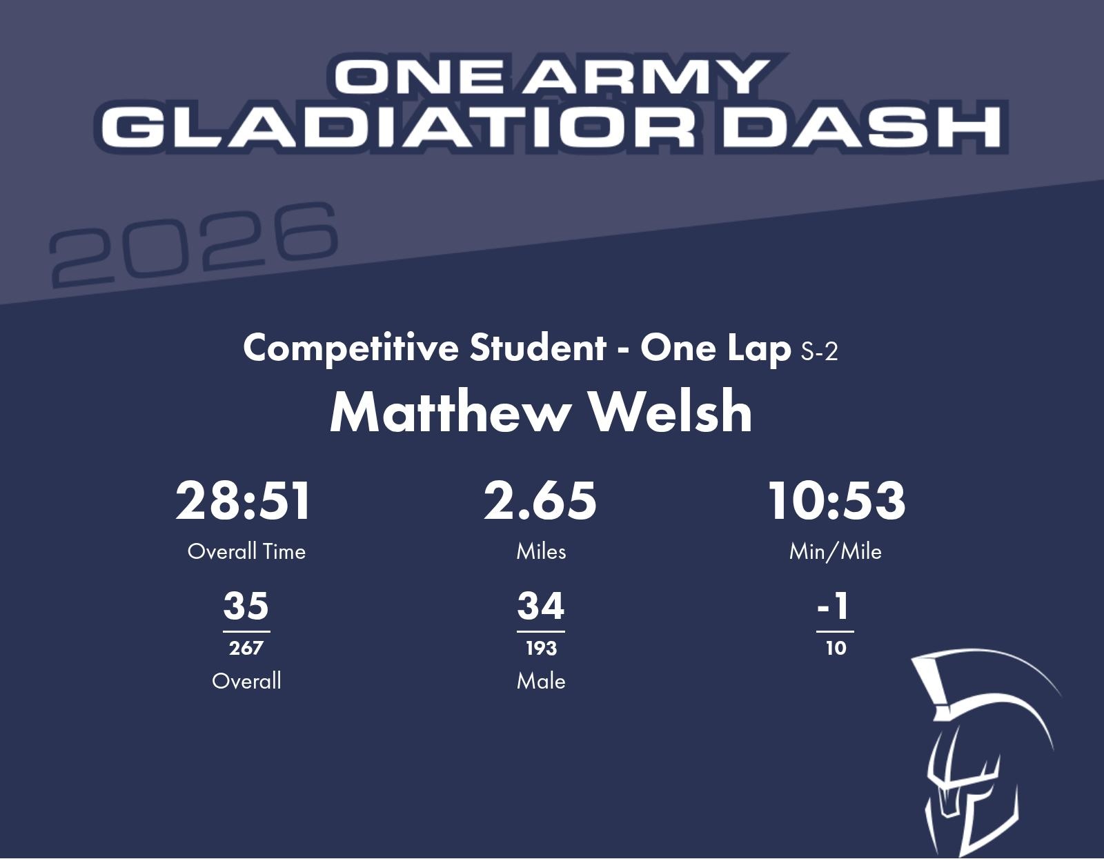 | Finish | 2.65 | 28:51 | 10:53/miles | 0.71 | 7:55 | 11:08/miles | 35 | 34 M | |