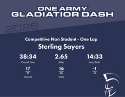 | Finish | 2.65 | 38:34 | 14:33/miles | 0.71 | 8:41 | 12:13/miles | 17 | 16 M | |