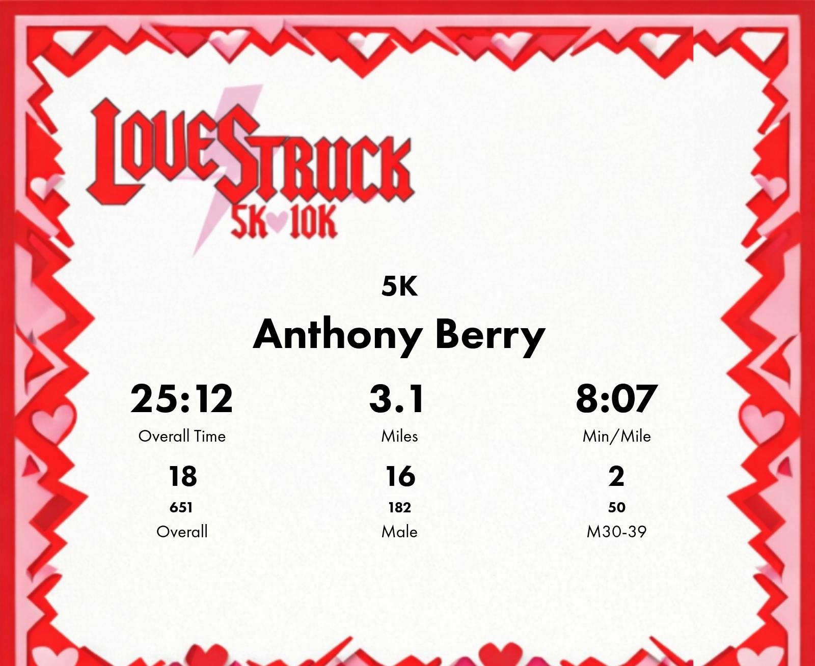 | Finish | 3.1 | 25:12 | 8:07/miles | 1.49 | 11:57 | 8:00/miles | 18 | 16 M | 2 M30-39 |