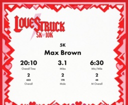 | Finish | 3.1 | 20:10 | 6:30/miles | 1.49 | 9:43 | 6:30/miles | 2 | 2 M | 2 M Overall |