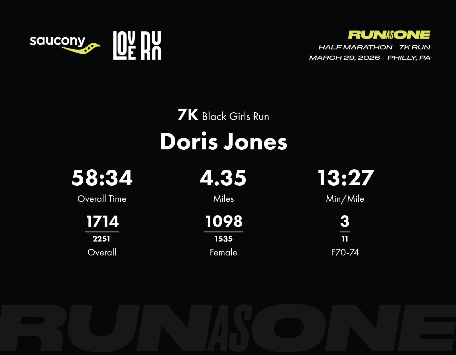 Date: March 29, 2026 Participant: Doris Jones #51758 Race: 2026 Saucony Love Run Philly 7K Distance: 4.35 miles