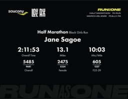 Date: March 29, 2026 Participant: Jane Sagoe #6032 Race: 2026 Saucony Love Run Philly Half Marathon Distance: 13.1 miles