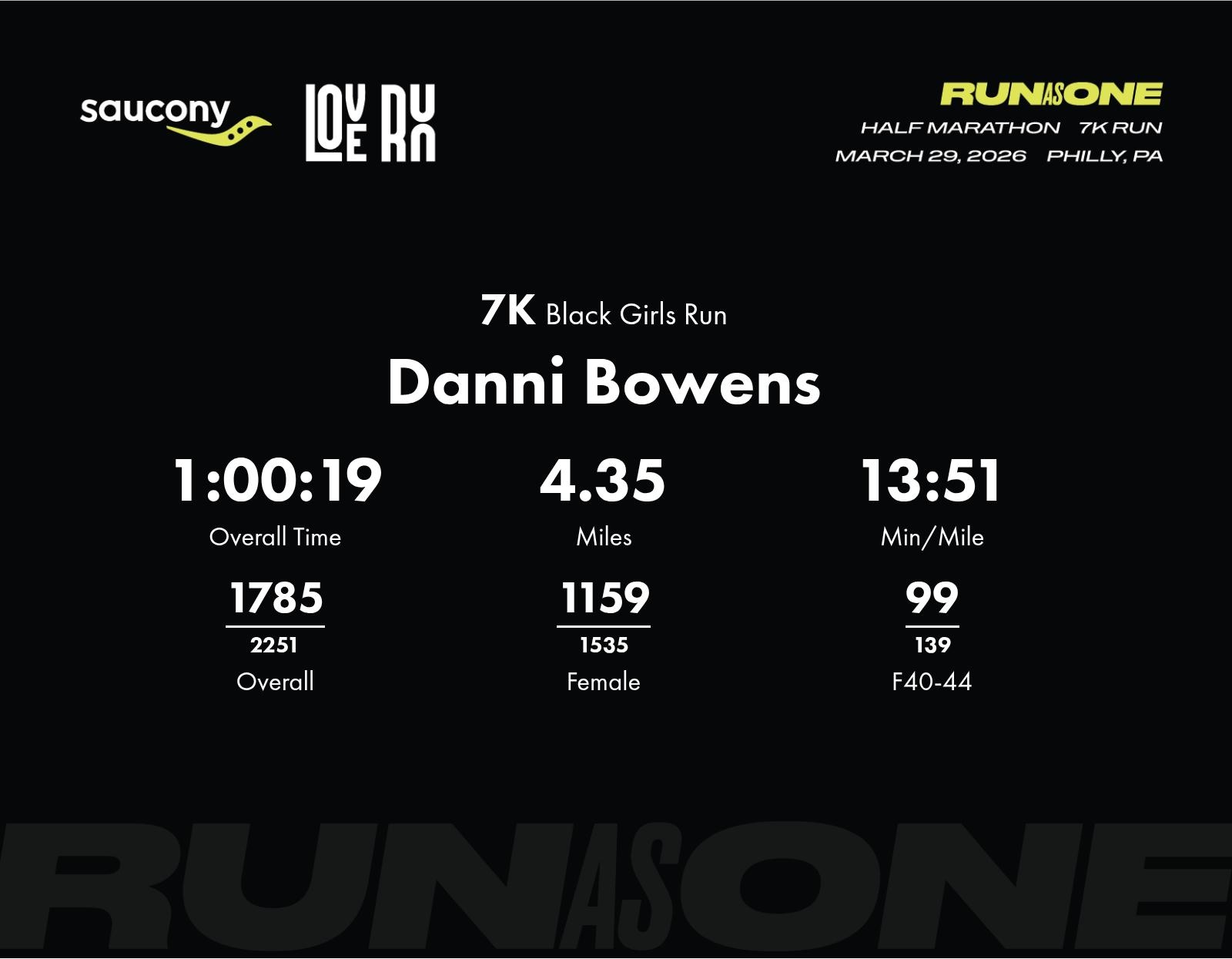 Date: March 29, 2026 Participant: Danni Bowens #52542 Race: 2026 Saucony Love Run Philly 7K Distance: 4.35 miles