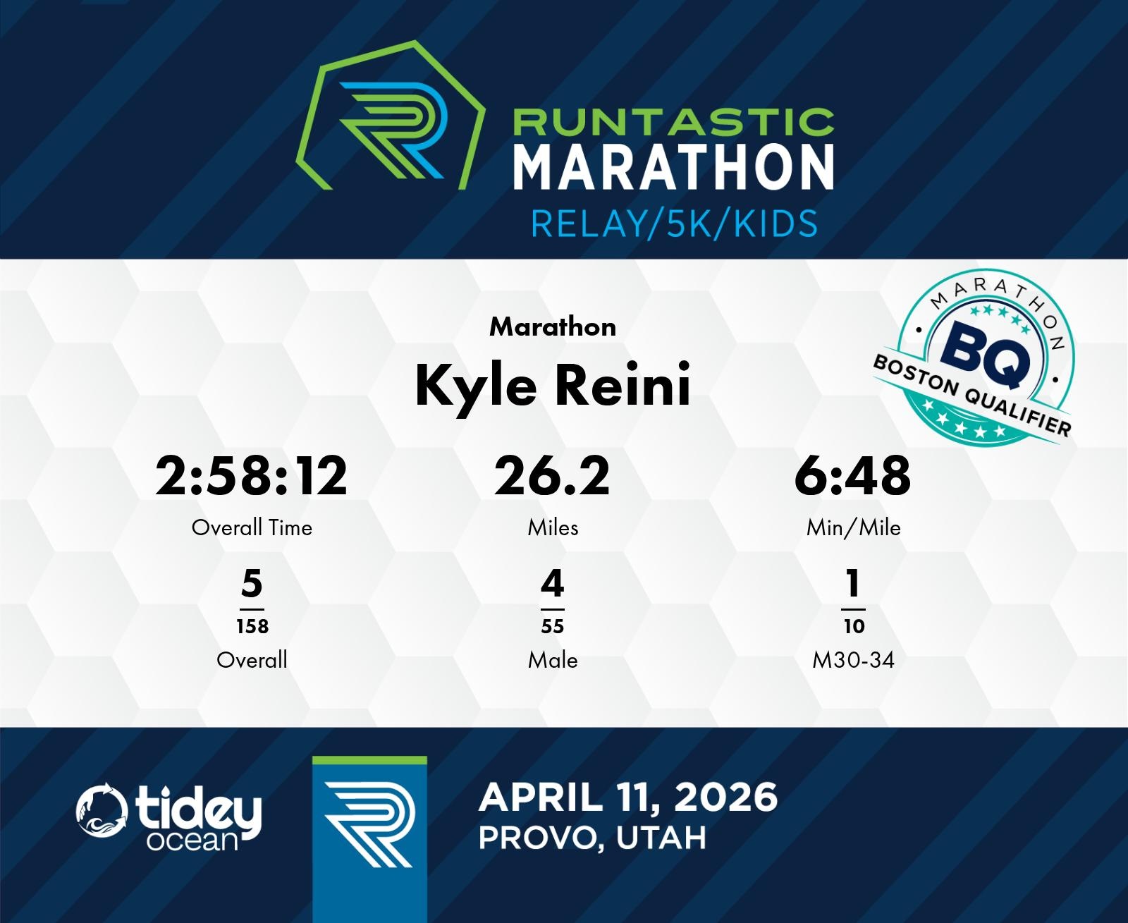 Date: April 11, 2026 Participant: Kyle Reini #1134 Race: 2026 Runtastic Marathon Distance: 26.2 miles