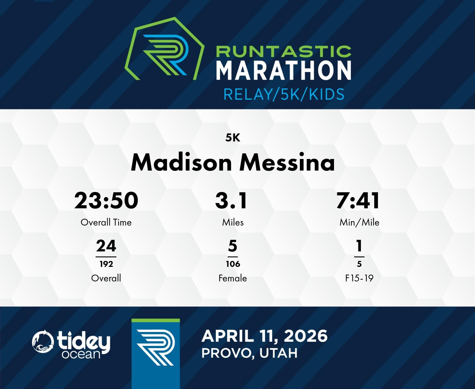 Date: April 11, 2026 Participant: Madison Messina #3059 Race: 2026 Runtastic 5K Distance: 3.1 miles