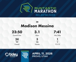 Excellent Division Performance in 5K Race Madison Messina completed the 5K at the 2026 Runtastic Marathon with an impressive finish time of 23:50, achieving a solid average pace of 7:41 min/mile. Her performance placed her 24th overall out of 202 participants and 5th among female competitors. Notably, she secured 1st place in the F15-19 division, demonstrating her competitive edge in her age group. A closer look at her splits reveals a consistent improvement throughout the race. Madison initially clocked in a 7:58 min/mile for the first mile, then sped up to 7:48 and finally to 7:30 min/mile by the third mile. Her best effort in the 2nd and 3rd miles led her to impressively rise in her division and gender placements. Continuing to focus on this pacing strategy could yield even more promising results in future races.
