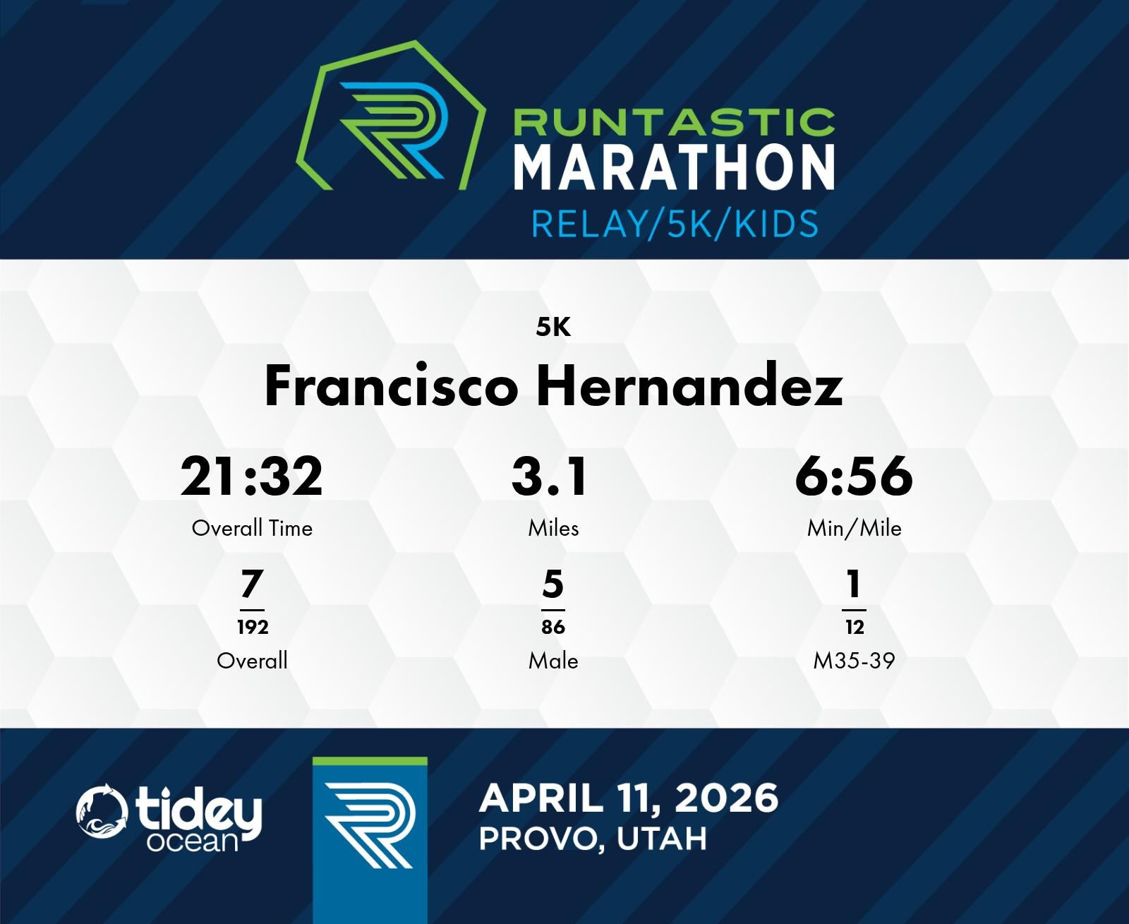 Date: April 11, 2026 Participant: Francisco Hernandez #3036 Race: 2026 Runtastic 5K Distance: 3.1 miles