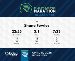 Consistent Pace and Strong Division Finish Shane Fowles maintained an impressive and consistent pace throughout the course of the 2026 Runtastic Marathon 5K event. Splits show a steady performance, starting with a 7:27 min/mile pace for both the first and second miles. Shane managed to slightly increase his speed in the third mile by clocking in at 7:20 min/mile. He completed the race with a strong overall elapsed pace of 7:23 min/mile. Shane finished with an official time of 22:55, placing 14th overall among 202 participants, 12th in the male category, and 3rd in the M35-39 division. His ability to sustain a competitive pace across each segment of the race is commendable. Focusing on maintaining or slightly improving this pace in the latter stages of the race can help in achieving even more impressive results in future events.