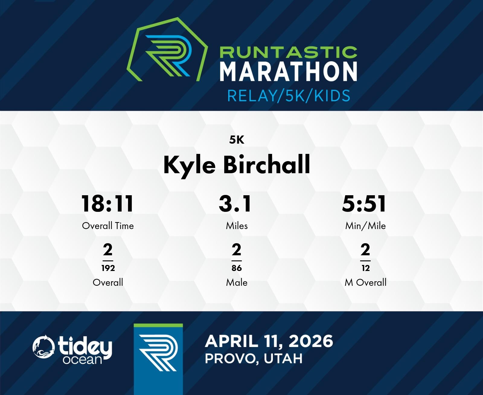 Date: April 11, 2026 Participant: Kyle Birchall #3142 Race: 2026 Runtastic 5K Distance: 3.1 miles