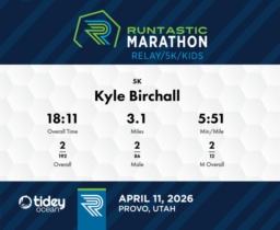 Consistent Pacing and Strong Finish Kyle Birchall displayed impressive consistency in his performance at the 2026 Runtastic Marathon 5K. Covering the course in a total time of 18:11, he maintained an average pace of 5:52 per mile. Notably, his split times showed remarkable steadiness, with only a one-second variation between his fastest and slowest miles. Throughout the race, Kyle secured the 2nd position overall and within his gender division, highlighting his place among the top competitors. His timing strategy was evident as he completed his first mile in 5:53, his second mile in 5:54, and picked up speed on the third mile with a time of 5:51. Kyle's ability to slightly increase his pace towards the end demonstrates strategic control and endurance. Continuing to refine pacing and strategies in similar competitive settings can further enhance his performance in future races. His solid results reflect determination and solid preparation.