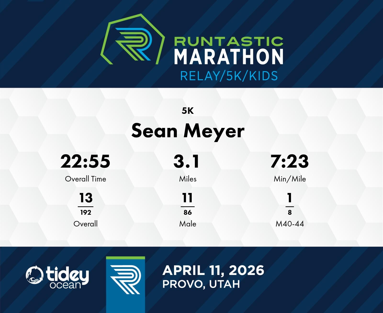 Date: April 11, 2026 Participant: Sean Meyer #3196 Race: 2026 Runtastic 5K Distance: 3.1 miles