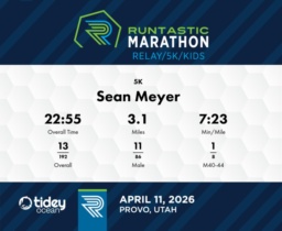 Consistent Pacing and Division Win Sean Meyer demonstrated impressive consistency in the 2026 Runtastic Marathon 5K. With an average pace of 7:23 min/mile, he completed the race in 22:55. His performance was notably strong within the Male 40-44 division, maintaining the lead through all splits. His first split of 7:22 set a steady tone, showing minimal variation in subsequent splits, with times of 7:25 and 7:26. While overall, Sean secured 13th place in a field of 202 competitors, his consistent split times helped him achieve an 11th place finish among male participants. Focusing on maintaining consistent pacing throughout the event in future races will be beneficial. His performance in South Jordan, UT, displays strong endurance and discipline across the race distance. Well done on taking the top spot in your division, Sean!