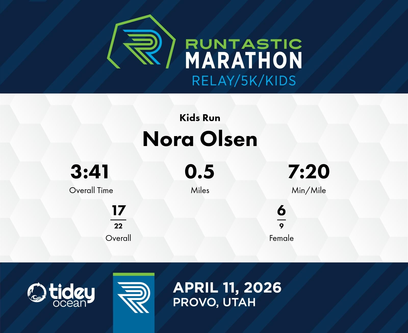 Outstanding Performance for a Young Runner Nora Olsen, a 6-year-old runner from Eagle Mountain, UT, demonstrated remarkable potential at the 2026 Runtastic Marathon in the Kids Run event. Completing the 0.5-mile course with an impressive elapsed time of 3:41, she maintained a swift pace of 7:22 minutes per mile. Among 25 participants, she finished strong overall and was notably 6th in her gender category. Her effort reflects a promising start in running, particularly with her ability to maintain a consistent pace throughout the race. As she continues to develop as a young athlete, focusing on building endurance and consistent pace management could further enhance her performances in future events. Nora's early achievement highlights her potential, and with further practice, she has an exciting path ahead in running.