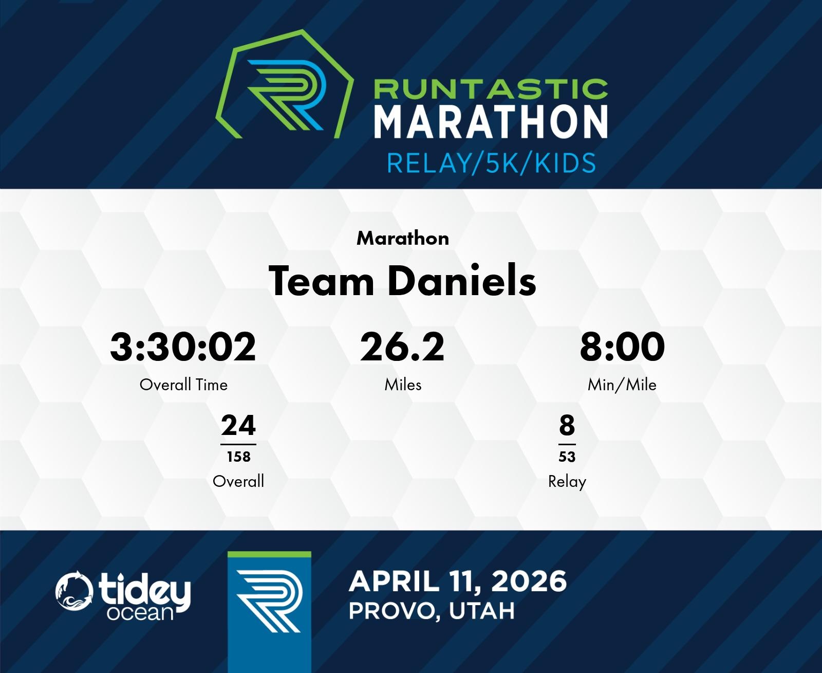 Date: April 11, 2026 Participant: Team Daniels #2032 Race: 2026 Runtastic Marathon Distance: 26.2 miles