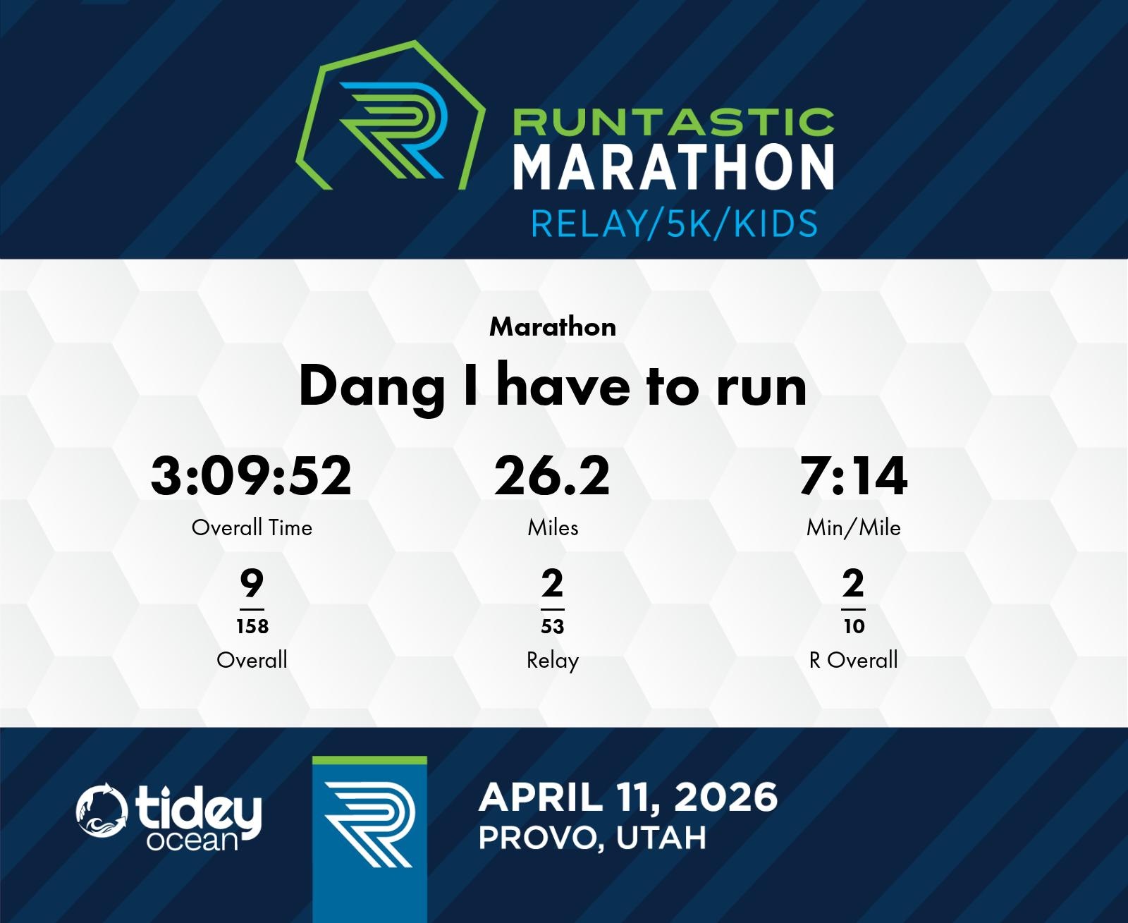 Date: April 11, 2026 Participant: Dang I have to run #2006 Race: 2026 Runtastic Marathon Distance: 26.2 miles