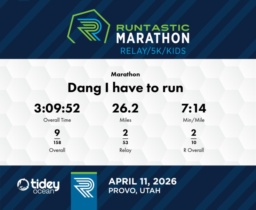 Consistent Performance with Strategic Pacing The relay team "Dang I have to run" demonstrated a steady and strategic race in the 2026 Runtastic Marathon. They maintained a consistent average pace of 7:14 min/mile over the 26.2-mile course, finishing with an impressive total time of 3:09:52. The team showed a strong start, with the first mile at a brisk pace of 6:07 min/mile, placing them 3rd in their category. Their pacing strategy was evident in the later stages of the race, where they managed consistent times despite the natural fatigue of the marathon distance. They encountered slightly slower split times in the latter part of the course, with splits ranging from 8:36 to 9:01 per mile towards the end. This relay secured the 2nd place in their gender category, highlighting their remarkable pacing and teamwork throughout the event. Focusing on maintaining even splits in future races could enhance overall timing.