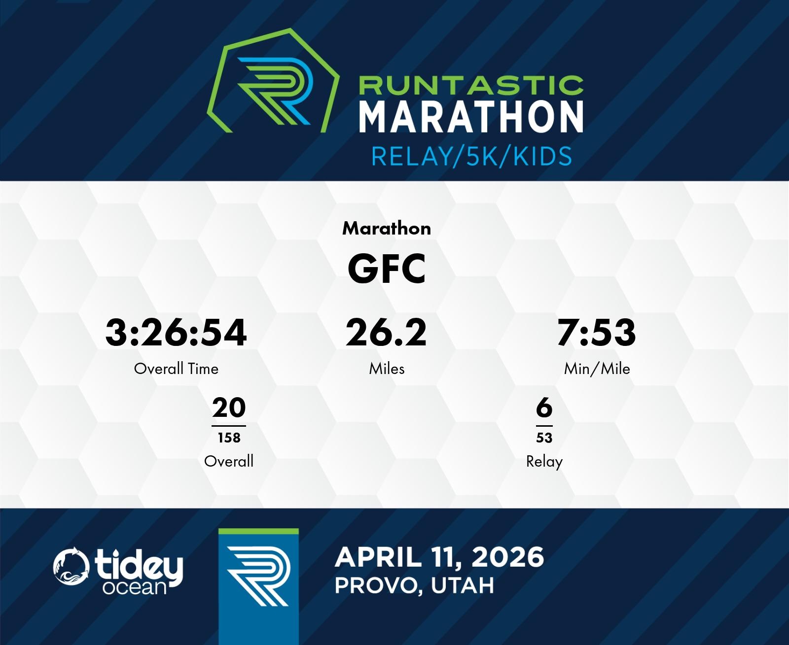 Consistent Pace with Strong Teamwork The relay team "GFC" from Lehi, UT demonstrated impressive consistency and teamwork during the 2026 Runtastic Marathon. With an overall elapsed time of 3:26:54, the team maintained an average pace of 7:53 min/mile, finishing 20th overall and 6th among relay teams out of 193 total participants. Their strategy was evident in their ability to regain momentum towards the marathon's conclusion, particularly from mile 21 onward where their pace quickened to under 7:30 min/mile. During the first half of the race, GFC started strong with a 6:42 min/mile in the first mile, despite some slowdown around mile 5 and mile 14. Their pacing from mile 22 to the finish strongly contributed to their final placement, highlighting their commitment to finish strong. Maintaining smooth transitions and focusing on consistent pacing can further enhance their team performance in future relay events.