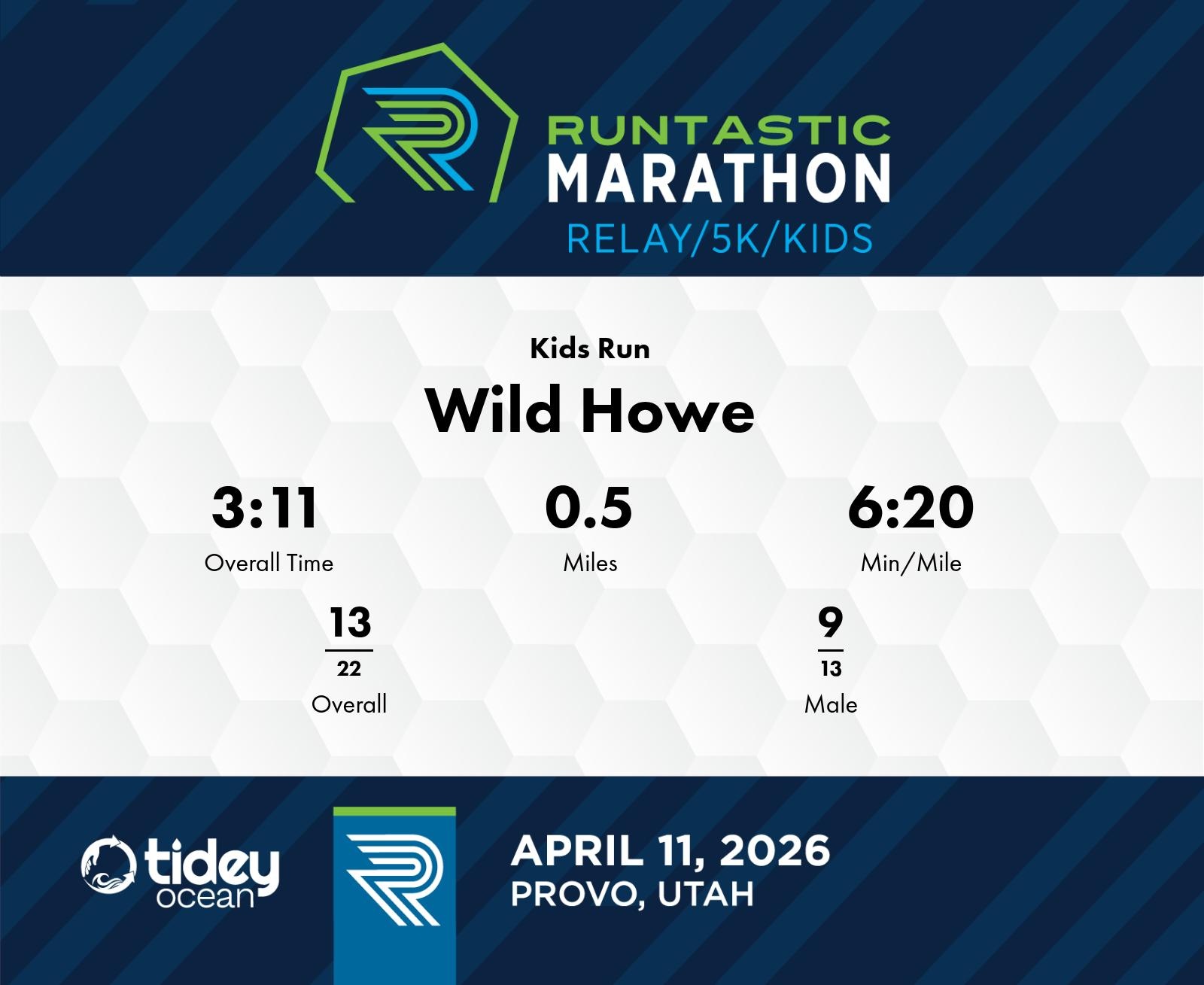 Date: April 11, 2026 Participant: Wild Howe #4011 Race: 2026 Runtastic Kids Run Distance: 1.0 miles