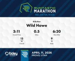 Impressive Performance by a Young Runner Wild Howe, a young runner from Lehi, UT, made a noteworthy mark at the 2026 Runtastic Marathon Kids Run. At just 9 years old, he completed the 0.5-mile race with an elapsed time of 3 minutes and 11 seconds. This translates to a commendable pace of 6:22 minutes per mile. Among the 25 participants, Wild secured a position that highlights his speed and determination. Despite being one of the youngest in the event, his performance stands out, especially his placement among male participants. To further enhance his race outcomes, focusing on consistent pacing throughout could prove beneficial. Great job on maintaining a strong pace!