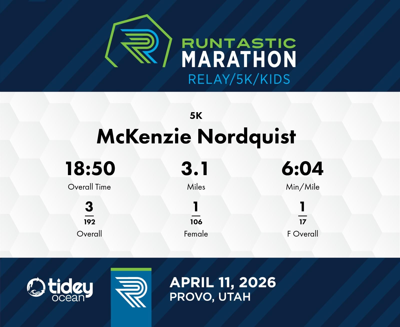 Date: April 11, 2026 Participant: McKenzie Nordquist #3176 Race: 2026 Runtastic 5K Distance: 3.1 miles