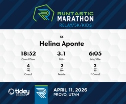 Consistent Speed with Strong Finish Helina Aponte delivered an outstanding performance at the 2026 Runtastic Marathon 5K event. She maintained a consistent pace throughout, starting with a swift 5:57 for the first mile, which was the fastest split of her race. Although her pace slightly decelerated to 6:08 in the second mile and 6:11 in the third mile, she managed an impressive average pace of 6:05 min/mile over the entire course. Her overall time of 18:52 placed her second in the female category, an admirable achievement among a field of 202 participants. Helina showed remarkable steadiness, holding her position in her division from start to finish. Continued focus on pacing strategy in the latter stages of the race could further enhance her performance. Overall, her effort was impressive, with her ability to maintain speed, particularly in the opening mile, serving as a strong foundation for future races.
