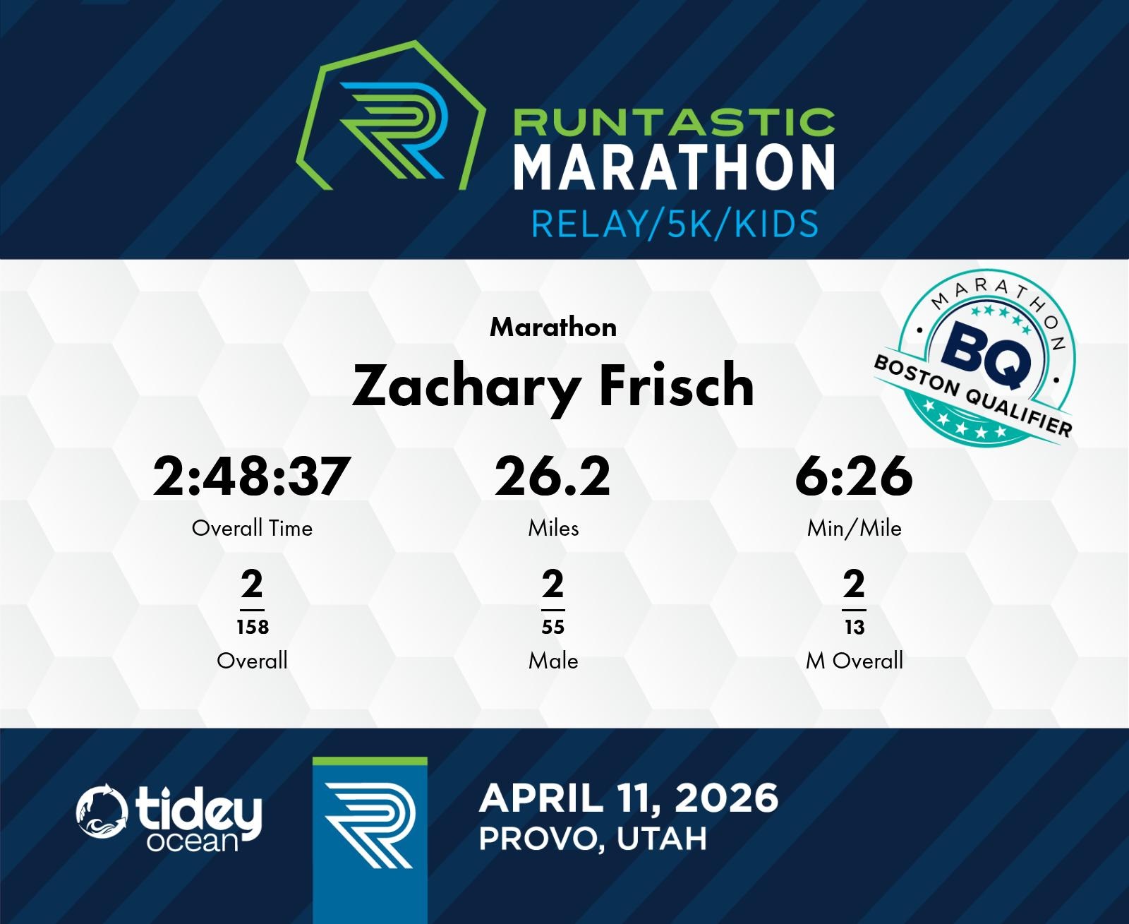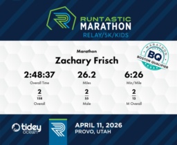 Date: April 11, 2026 Participant: Zachary Frisch #1142 Race: 2026 Runtastic Marathon Distance: 26.2 miles