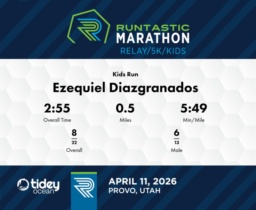 Impressive Young Performance Ezequiel Diazgranados, at just 5 years old, ran a remarkable half-mile in 2 minutes and 55 seconds at the 2026 Runtastic Marathon's Kids Run. His average pace was 5:51 minutes per mile. Out of 25 participants, Ezequiel finished 8th overall and was 6th among the male competitors. These achievements reflect his impressive capabilities and potential in running. While Ezequiel's performance is commendable, focusing on maintaining a steady pace can help sustain speed throughout the race. Keep nurturing this young talent; his efforts are already paying off significantly.
