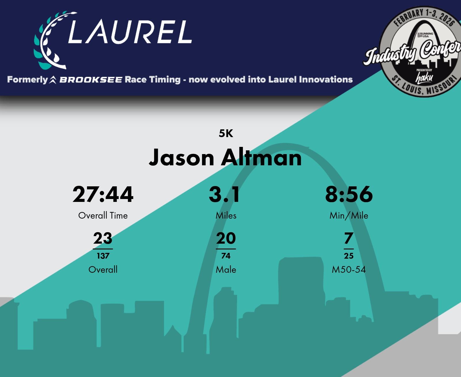 Consistent Improvement Amidst the Run Jason Altman completed the 2026 RUSA Monday Morning Run in 27:44, navigating through 3.1 miles with an average pace of 8:56 min/mile. Over the course, Jason improved his pace with each mile: starting at 9:09 min/mile and finishing strong with an 8:43 min/mile split. He placed 23rd overall in a field of 189 participants. Showcasing strong performance in his age group, Jason secured the 7th spot within the Male 50-54 division. Throughout the run, Jason maintained a steady performance among male participants, finishing 20th in the male category.