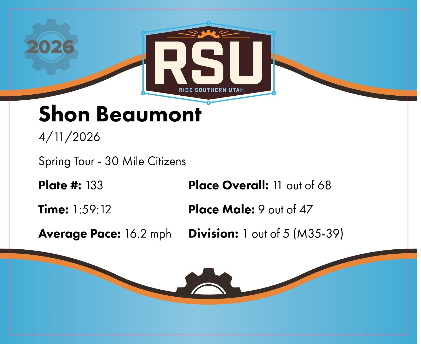 | Finish | 32.26 | 1:59:12 | 16.2 mph | 2.26 | 14:53 | 9.1 mph | 11 | 9 M | 1 M35-39 |