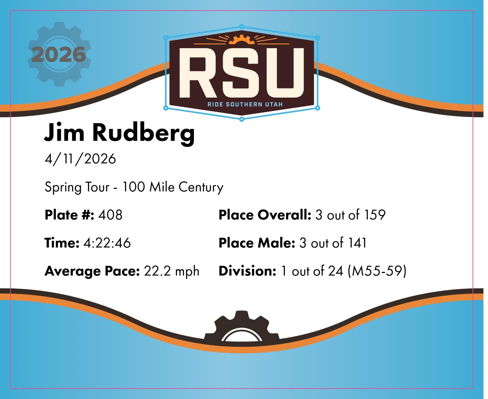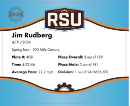 | Finish | 97.2 | 4:22:46 | 22.2 mph | 27.2 | 1:22:09 | 19.9 mph | 3 | 3 M | 1 M55-59 |