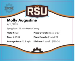| Mile 60 | 60.0 | 3:22:45 | 17.8 mph | 10.0 | 34:45 | 17.3 mph | 25 | 7 F | 1 F30-34 |