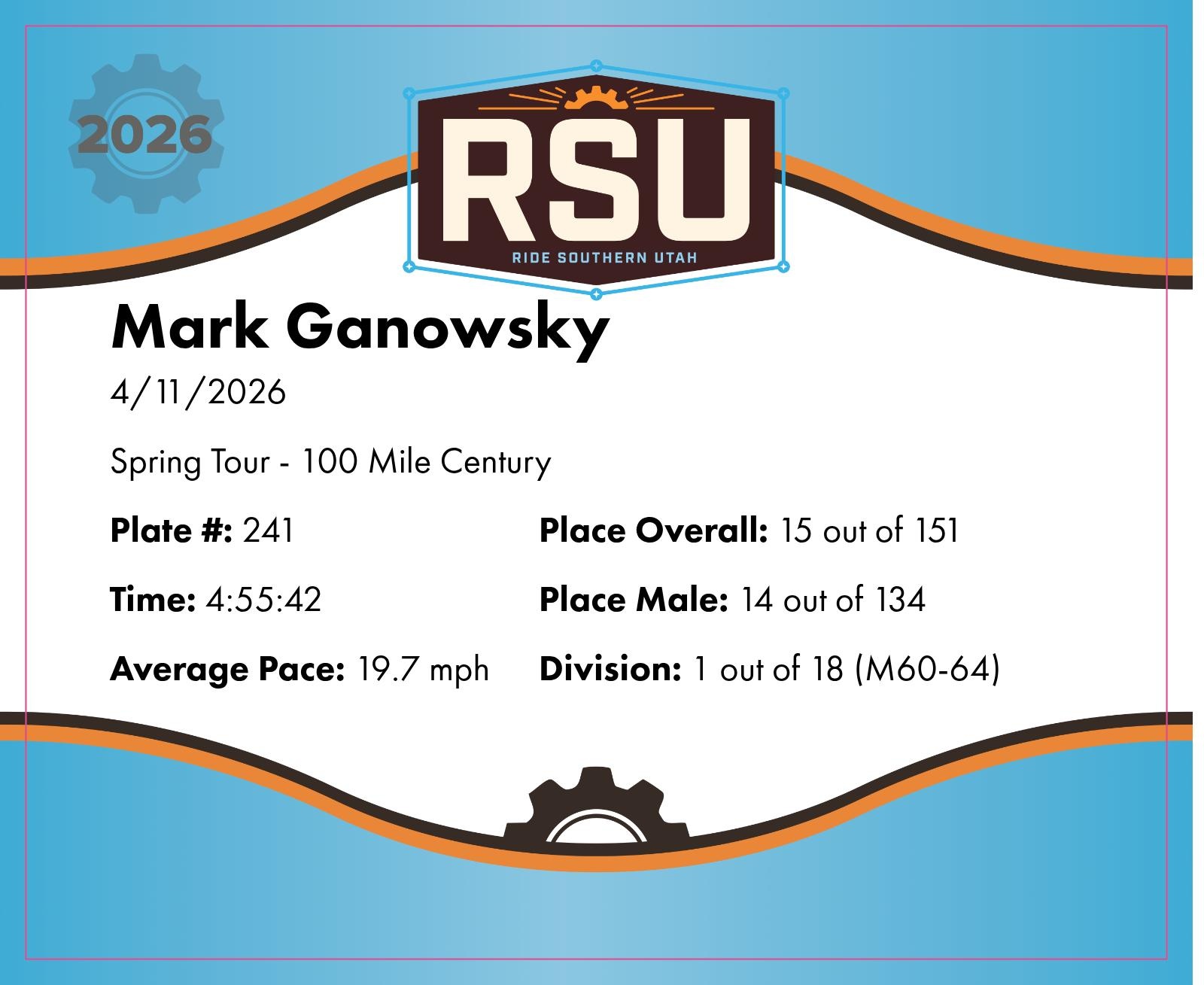 | Finish | 97.2 | 4:55:42 | 19.7 mph | 27.2 | 1:38:49 | 16.5 mph | 15 | 14 M | 1 M60-64 |