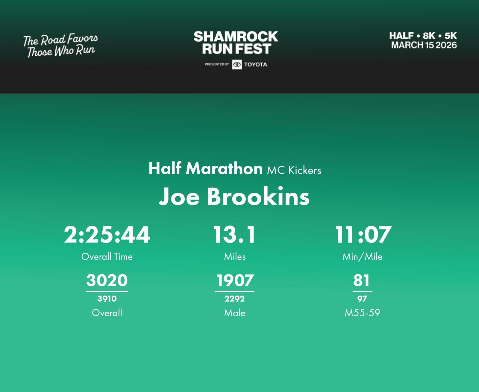 Date: March 15, 2026 Participant: Joe Brookins #1242 Race: 2026 Shamrock Run Fest presented by Toyota Half Marathon Distance: 13.1 miles