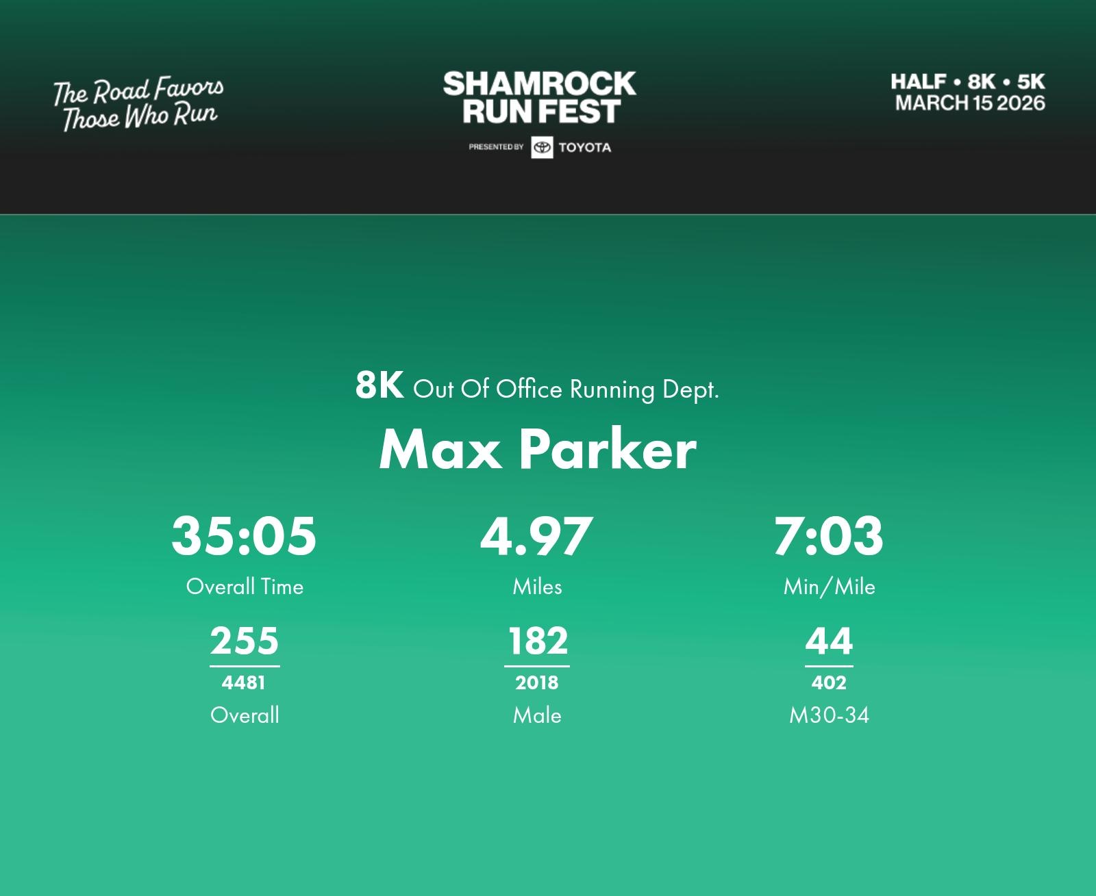 Date: March 15, 2026 Participant: Max Parker #30413 Race: 2026 Shamrock Run Fest presented by Toyota 8K Distance: 5.0 miles