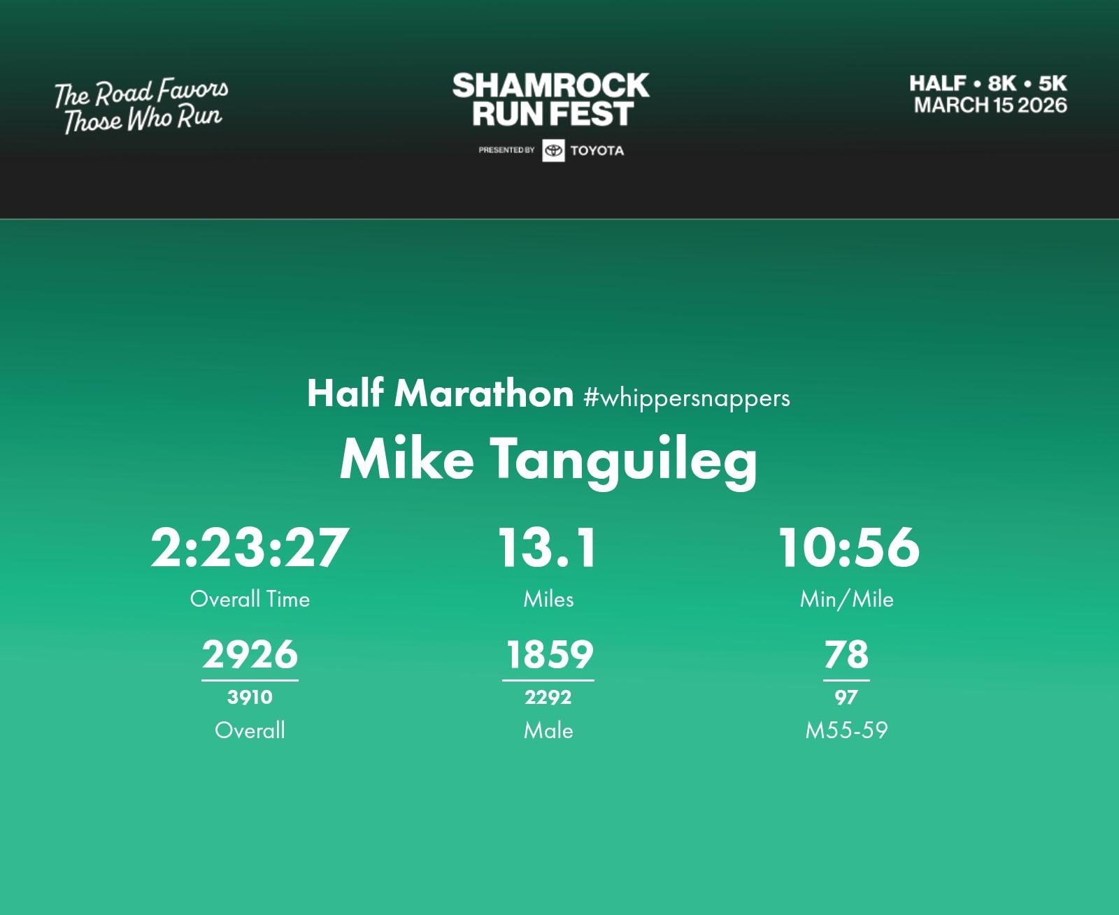 Date: March 15, 2026 Participant: Mike Tanguileg #1001 Race: 2026 Shamrock Run Fest presented by Toyota Half Marathon Distance: 13.1 miles