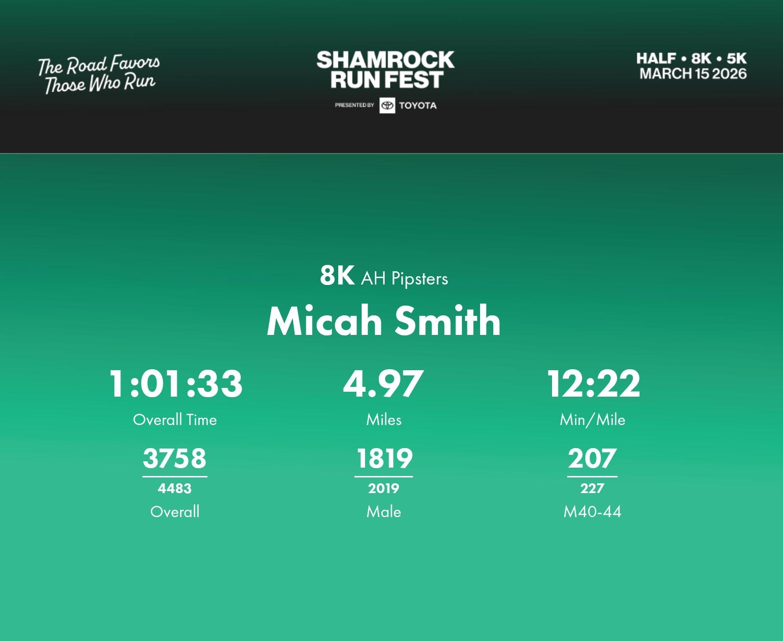 Date: March 15, 2026 Participant: Micah Smith #30018 Race: 2026 Shamrock Run Fest presented by Toyota 8K Distance: 5.0 miles