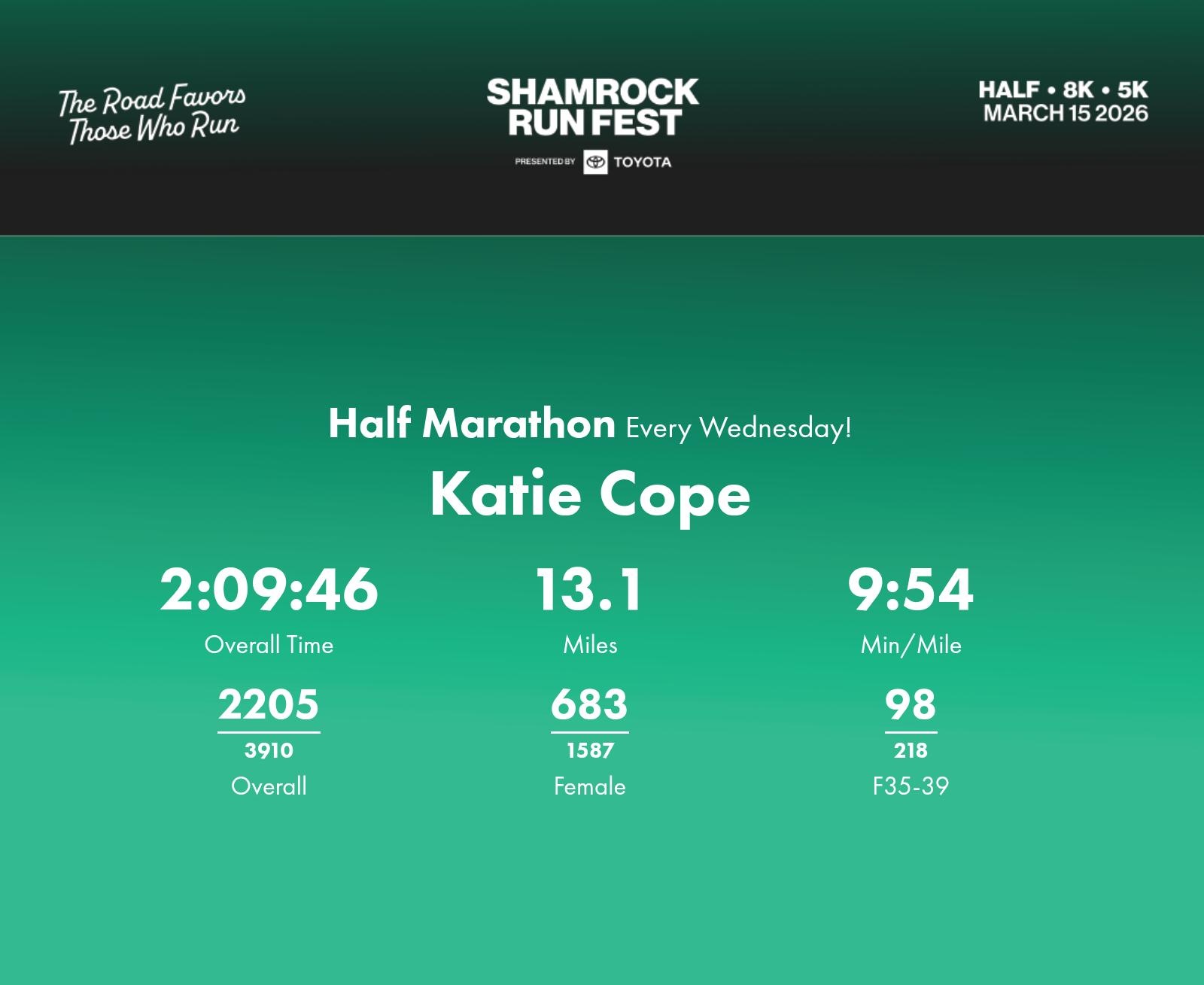 Date: March 15, 2026 Participant: Katie Cope #1114 Race: 2026 Shamrock Run Fest presented by Toyota Half Marathon Distance: 13.1 miles