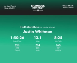 Date: March 15, 2026 Participant: Justin Whitman #1966 Race: 2026 Shamrock Run Fest presented by Toyota Half Marathon Distance: 13.1 miles