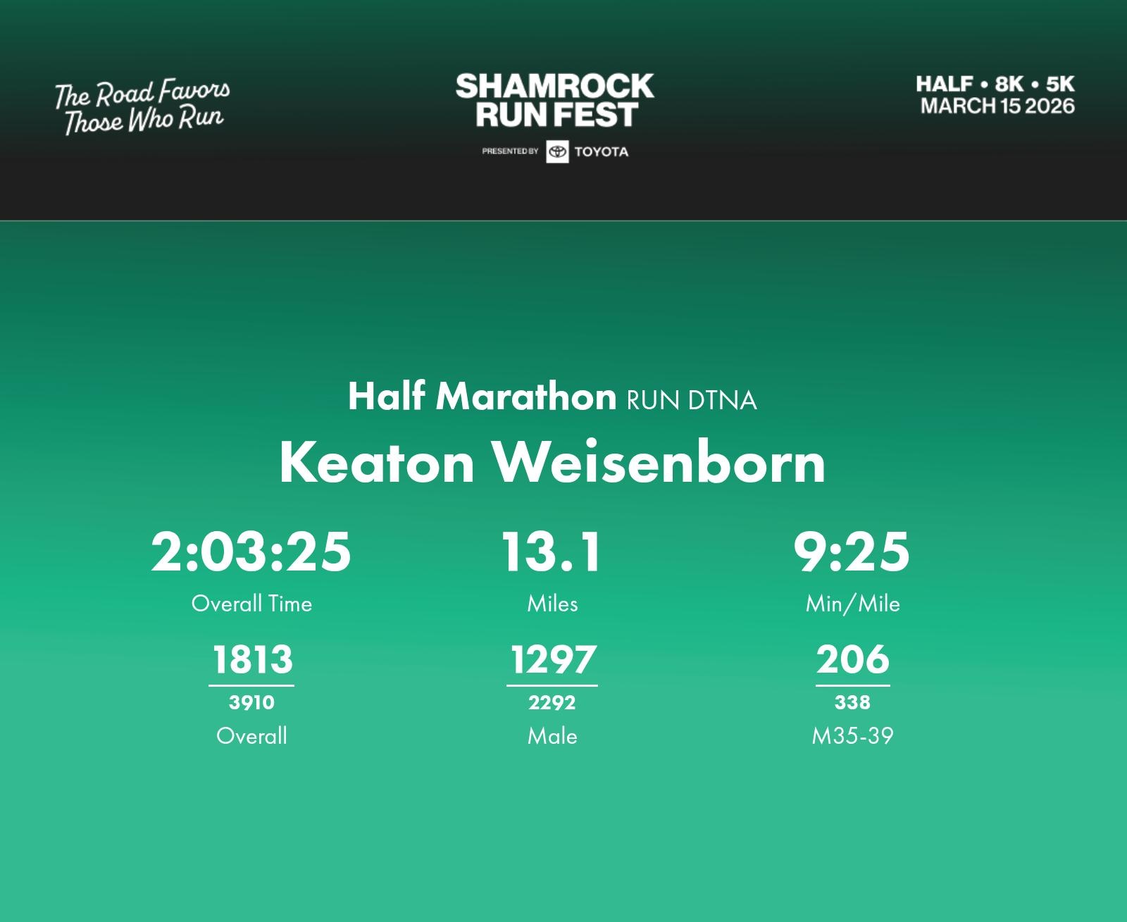 Date: March 15, 2026 Participant: Keaton Weisenborn #1484 Race: 2026 Shamrock Run Fest presented by Toyota Half Marathon Distance: 13.1 miles