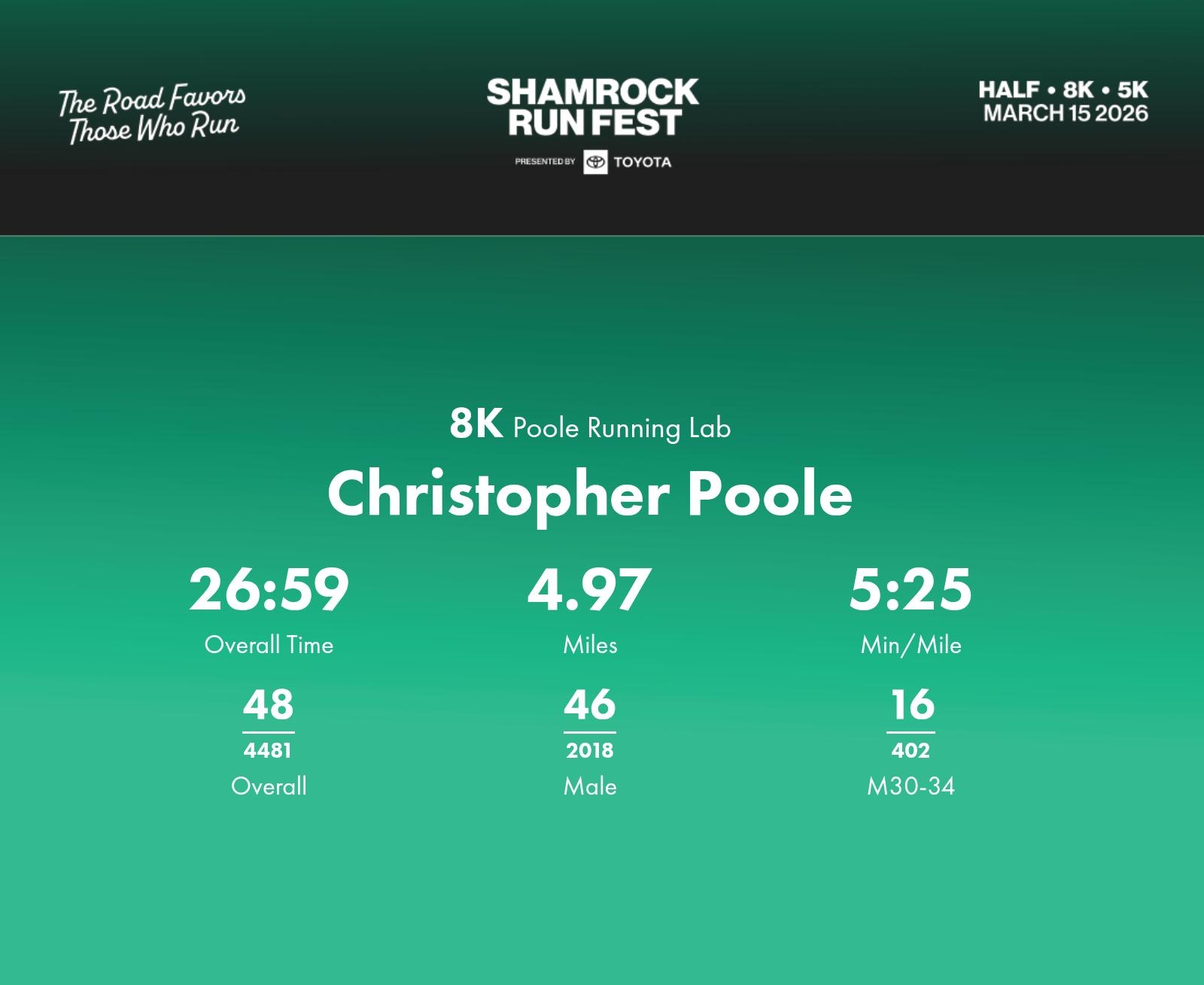 Date: March 15, 2026 Participant: Christopher Poole #30461 Race: 2026 Shamrock Run Fest presented by Toyota 8K Distance: 5.0 miles