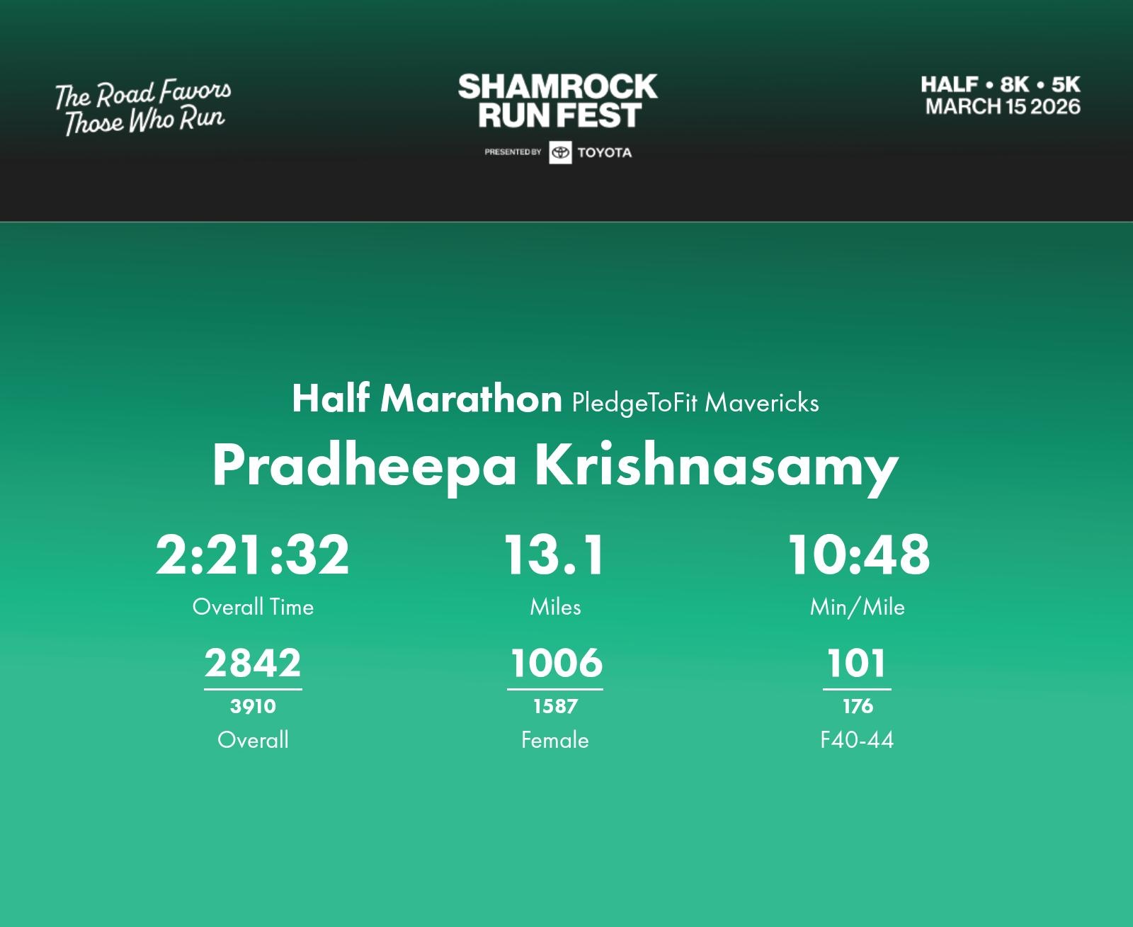 Date: March 15, 2026 Participant: Pradheepa Krishnasamy #1336 Race: 2026 Shamrock Run Fest presented by Toyota Half Marathon Distance: 13.1 miles