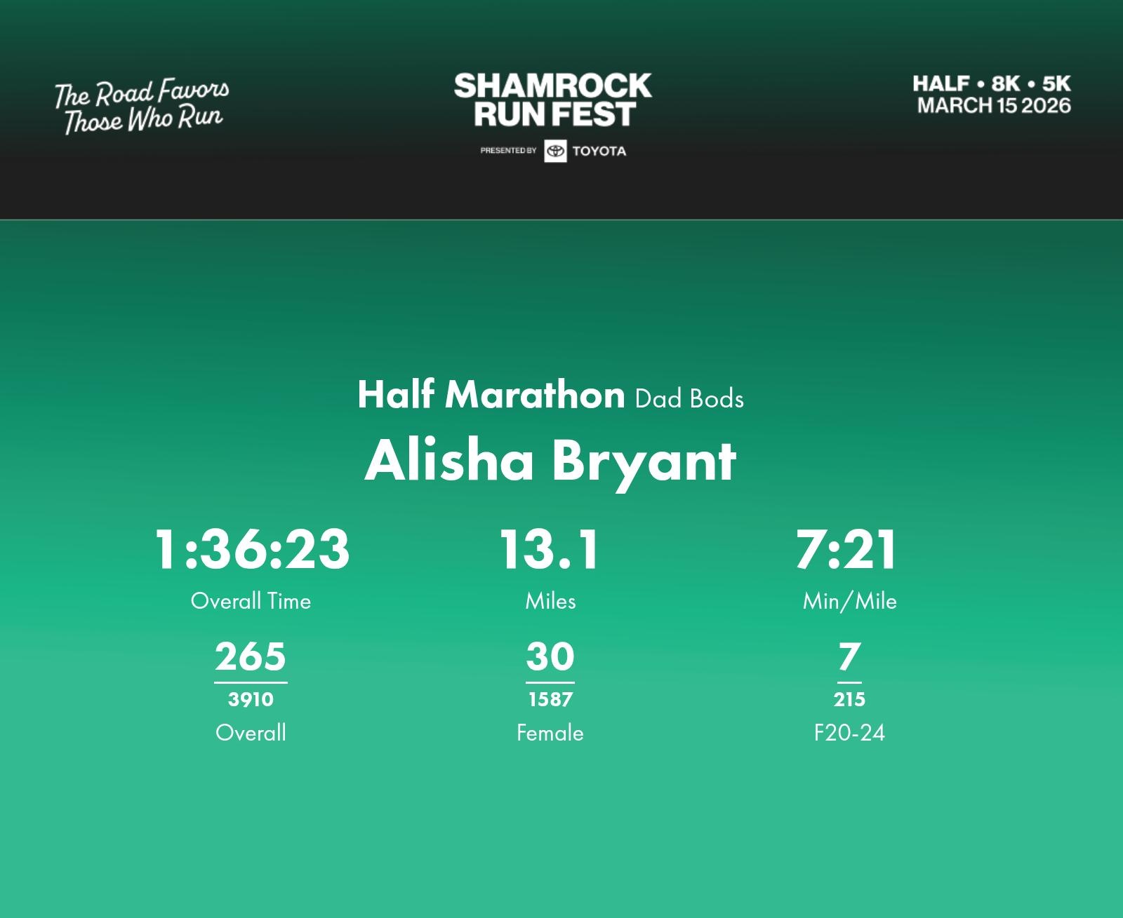 Date: March 15, 2026 Participant: Alisha Bryant #3293 Race: 2026 Shamrock Run Fest presented by Toyota Half Marathon Distance: 13.1 miles