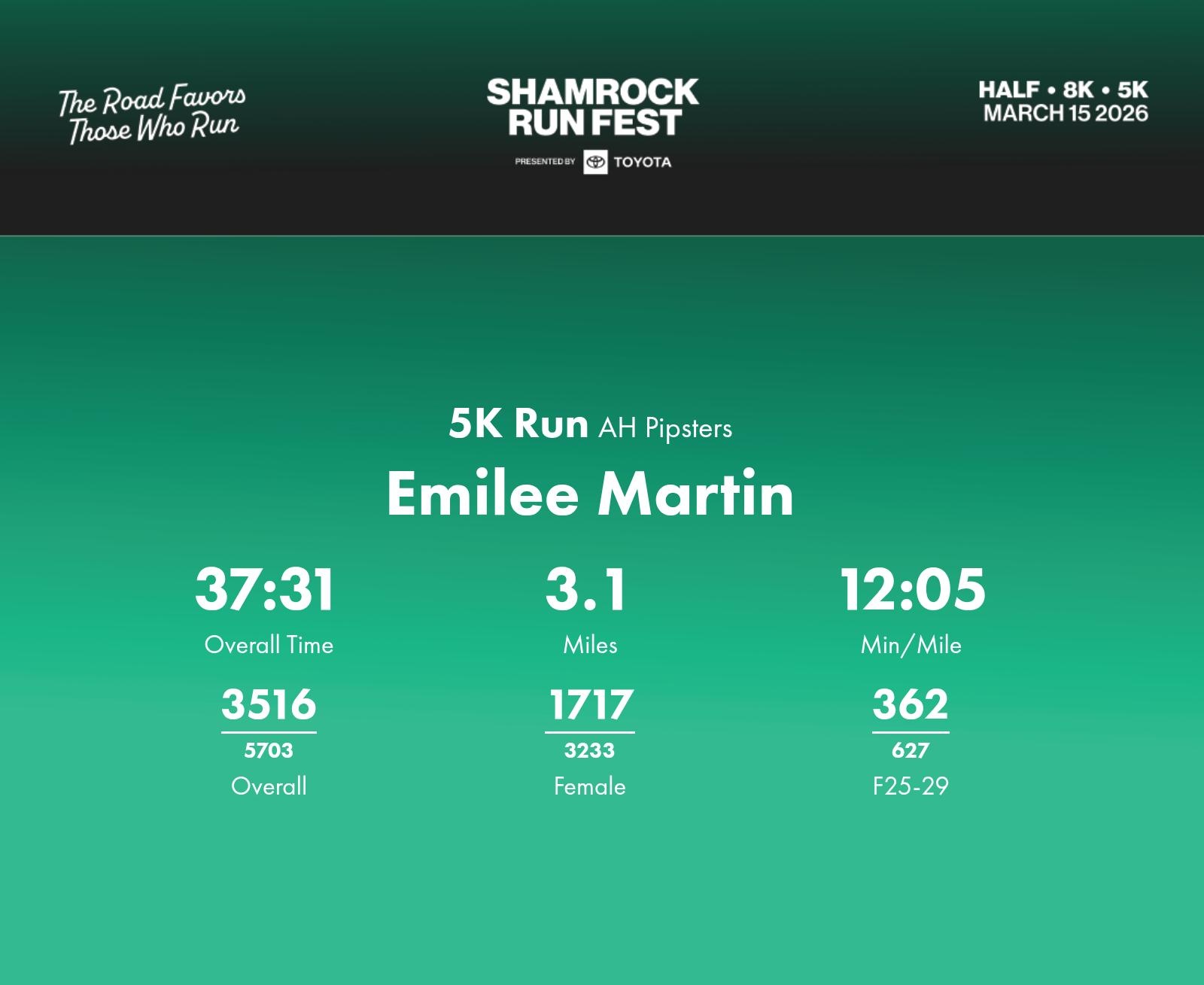 Date: March 15, 2026 Participant: Emilee Martin #40072 Race: 2026 Shamrock Run Fest presented by Toyota 5K Run Distance: 3.1 miles