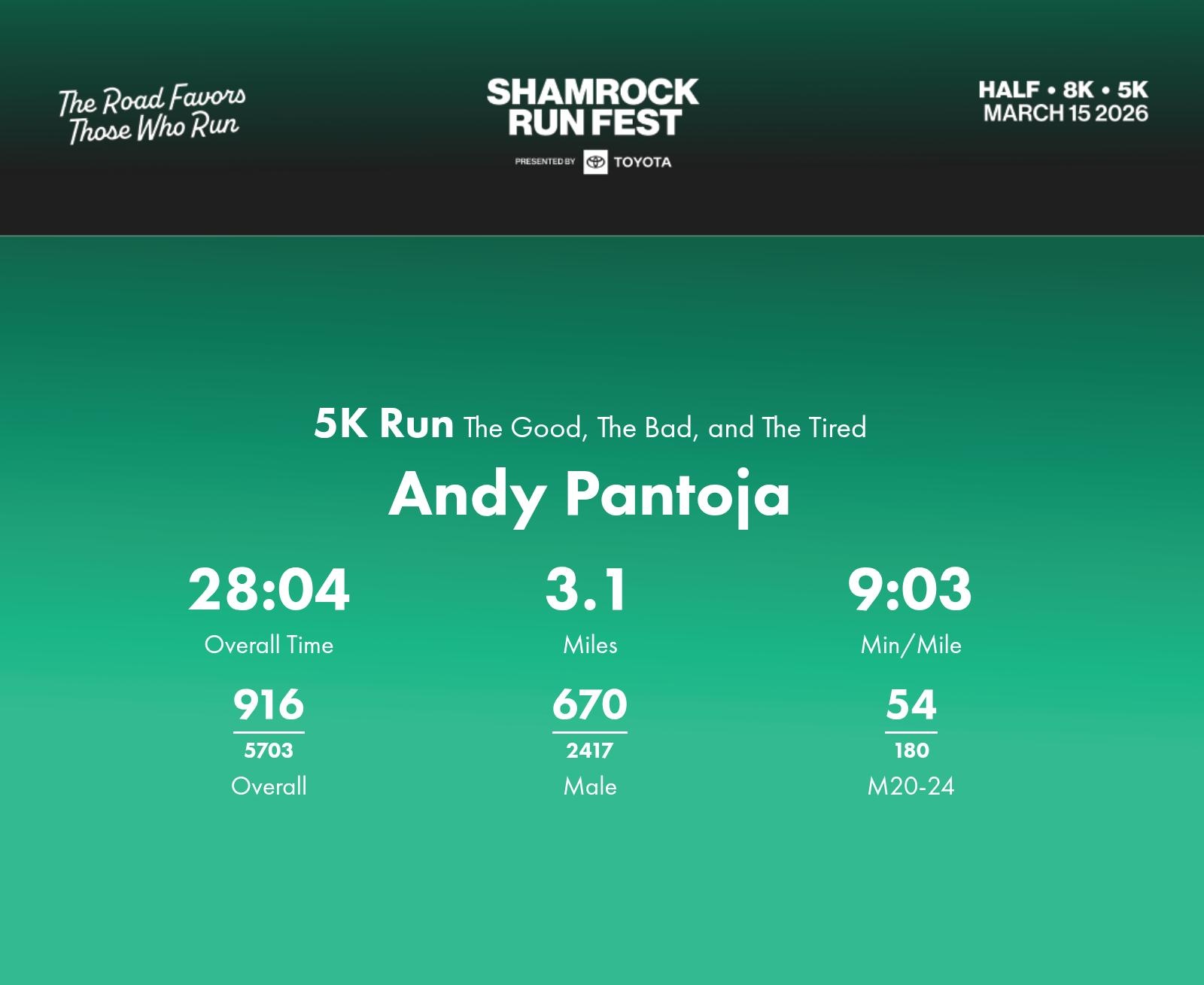 Date: March 15, 2026 Participant: Andy Pantoja #41882 Race: 2026 Shamrock Run Fest presented by Toyota 5K Run Distance: 3.1 miles