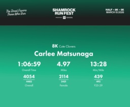 Date: March 15, 2026 Participant: Carlee Matsunaga #30084 Race: 2026 Shamrock Run Fest presented by Toyota 8K Distance: 5.0 miles