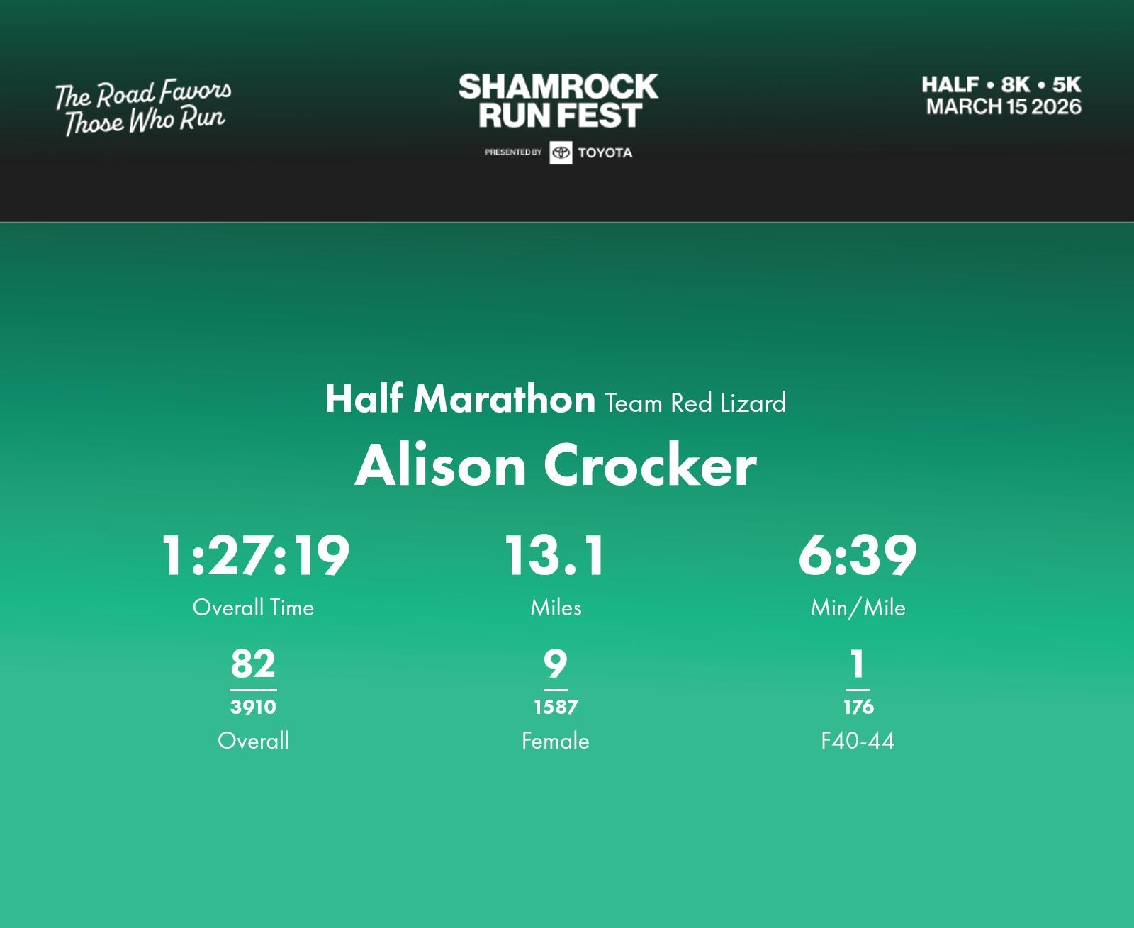 Date: March 15, 2026 Participant: Alison Crocker #1577 Race: 2026 Shamrock Run Fest presented by Toyota Half Marathon Distance: 13.1 miles